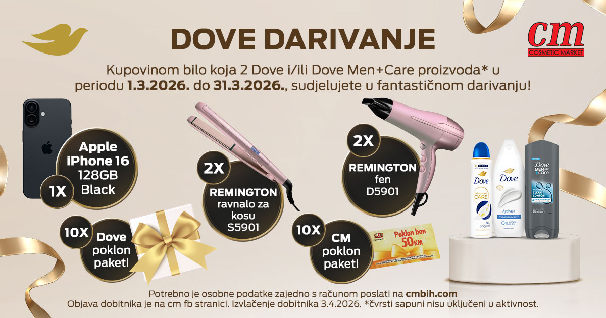 Kupovinom bilo koja 2 Dove i/ili Dove Men+Care proizvoda* u periodu 01.03. do 31.03.2026., sudjelujete u darivanju u kojem možete osvojiti vrijedne darove!